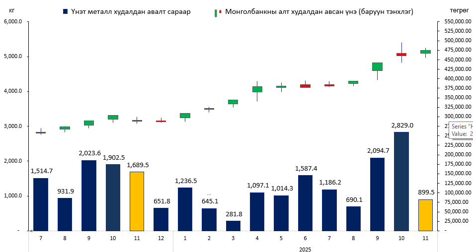 Монголбанк 2025 оны 11 дүгээр сард 899.5 кг, оны эхнээс өссөн дүнгээр нийт 13.6 тонн үнэт металл, үүнээс Дархан-Уул аймаг дахь Монголбанкны хэлтэс 760.7 кг, Баянхонгор аймаг дахь Монголбанкны хэлтэс 1,665.1 кг үнэт металл худалдан авсан байна. Энэ нь өмнөх оны мөн үетэй харьцуулбал 14.2 хувиар буурсан үзүүлэлттэй байна.